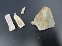 ESP05 - cavidade BM-158: amostra é um fragmento de uma estalactite decimétrica com material externo de tonalidade esbranquiçada recoberto por fina camada de argila. Este material é composto de mineral carbonático recristalizado.